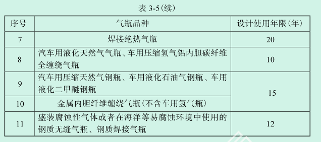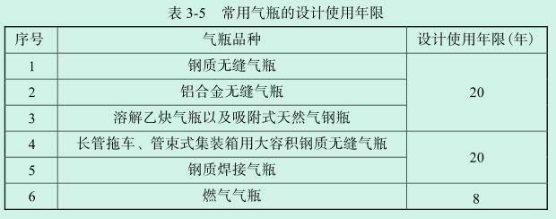 制造單位應當明確氣瓶的設計使用年限,并且在設計文件和制造標志上注明。氣瓶瓶體的實際使用年限應當滿足表3-5的規定,表3-5中未列入的氣瓶設計使用年限應當在相應產品標準中做出規定。如果氣瓶制造單位在出場的氣瓶上刻印或壓鑄充裝單位標志并裝設可追溯的電子識讀標志,充裝單位能夠確保氣瓶始終處于良好的維護保養狀態并通過安全評估,鋼制無縫氣瓶或者鋁合金氣瓶的實際使用年限可以延長至30年,燃氣氣瓶的實際使用年限可以延長至12年。