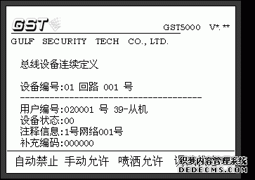 GST聯(lián)網(wǎng)時(shí),聯(lián)網(wǎng)控制器必須定義網(wǎng)絡(luò)中所有的控制器。定義方式同總線設(shè)備定義,如圖8-7。進(jìn)入設(shè)備定義界面,按照?qǐng)D8-7所示在回路號(hào)編輯框中輸入控 制器的聯(lián)網(wǎng)板號(hào),設(shè)備號(hào)為要定義的控制器聯(lián)網(wǎng)地址(范圍001-032),如001號(hào)是指該條網(wǎng)絡(luò)中的1號(hào)從機(jī),002號(hào)指的是該條網(wǎng)絡(luò)中的2號(hào)從 機(jī),003號(hào)指的是3號(hào)從機(jī)……。用戶編碼是指各個(gè)從機(jī)的控制器二次碼,設(shè)備類型為39-從機(jī)。