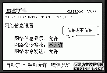 - 網(wǎng)絡(luò)命令接收-允許:控制器接收網(wǎng)絡(luò)上傳來的啟動(dòng)、停動(dòng)、屏蔽、取消屏蔽、自檢等網(wǎng)絡(luò)命令,并執(zhí)行這些命令;