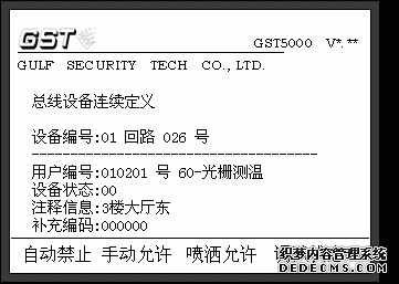 GST網(wǎng)絡(luò)系統(tǒng)適用于分布式建筑群,每個(gè)建筑體相對(duì)獨(dú)立,同時(shí)又需要信息交互或集中監(jiān)控。GST網(wǎng)絡(luò)系統(tǒng)可完成網(wǎng)絡(luò)中各控制器間的信息交換,這些信息包括:系統(tǒng)內(nèi)的任一控制器所聯(lián)接的外部設(shè)備發(fā)生的火警、反饋、故障等信息;任一控制器對(duì)網(wǎng)絡(luò)中 所連接設(shè)備發(fā)出的啟動(dòng)、停動(dòng)等控制命令信息。因此,網(wǎng)絡(luò)中的每一臺(tái)控制器均可完成對(duì)網(wǎng)絡(luò)信息的顯示和對(duì)網(wǎng)絡(luò)中任意設(shè)備的控制。網(wǎng)絡(luò)控制器對(duì)網(wǎng)絡(luò)現(xiàn)場(chǎng)設(shè)備的 控制包括兩種方式:一種是手動(dòng)啟動(dòng)方式,一種是自動(dòng)聯(lián)動(dòng)方式。手動(dòng)啟動(dòng)方式即通過任意一臺(tái)控制器的手動(dòng)盤或控制鍵盤均可啟動(dòng)網(wǎng)絡(luò)中的任意一個(gè)現(xiàn)場(chǎng)設(shè)備;自 動(dòng)聯(lián)動(dòng)方式即當(dāng)網(wǎng)絡(luò)中的火警信息滿足任意一臺(tái)控制器所存儲(chǔ)的聯(lián)動(dòng)公式時(shí),該控制器將發(fā)出自動(dòng)啟動(dòng)對(duì)應(yīng)現(xiàn)場(chǎng)設(shè)備的控制命令。正因?yàn)槿绱耍?strong>GST系列控制器網(wǎng)絡(luò)系統(tǒng)設(shè)備定義中千萬要注意不能出現(xiàn)不同設(shè)備具有相同二次碼的情況,以免出現(xiàn)誤啟動(dòng)。
