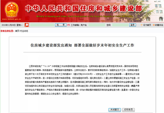 住建部發布通知 部署全面做好歲末年初安全生產工作